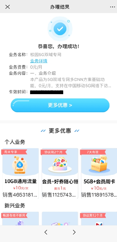 5.成功开通后,会收到企业微信如下图所示的5G业务开通信息。