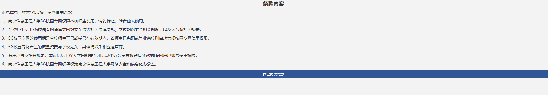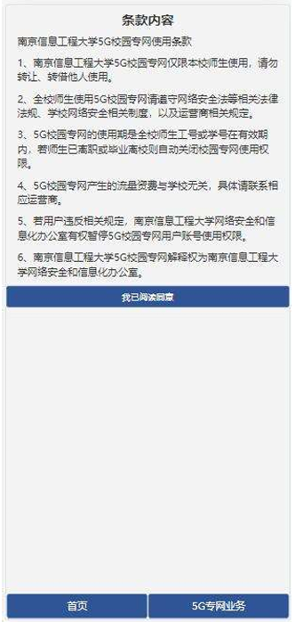 5.若用户违反相关规定,南京信息工程大学信息化建设与管理处(网络信息中心)有权暂停5G校园专网用户账号使用权限。