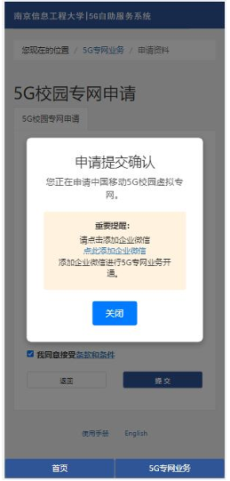 (1)在5G自主服务系统申请提交后,在弹框中点击“点此添加企业微信”,扫描二维码添加校园经理企业微信,添加成功后将会推送5G专网开通链接。
