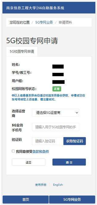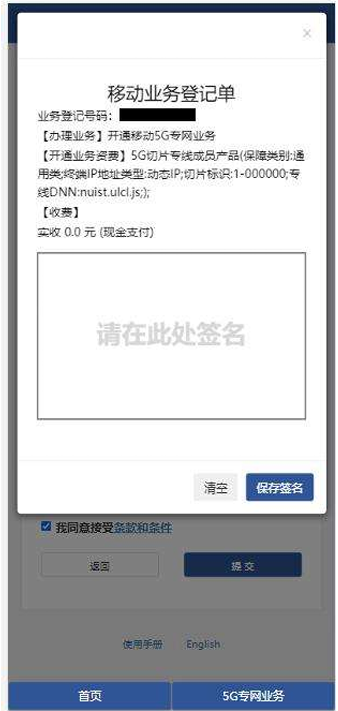 3.填写相关信息,确保申请5G校园专网的手机号段归属地为南京市,填写完成后阅读对应条款点击提交并进行签名。