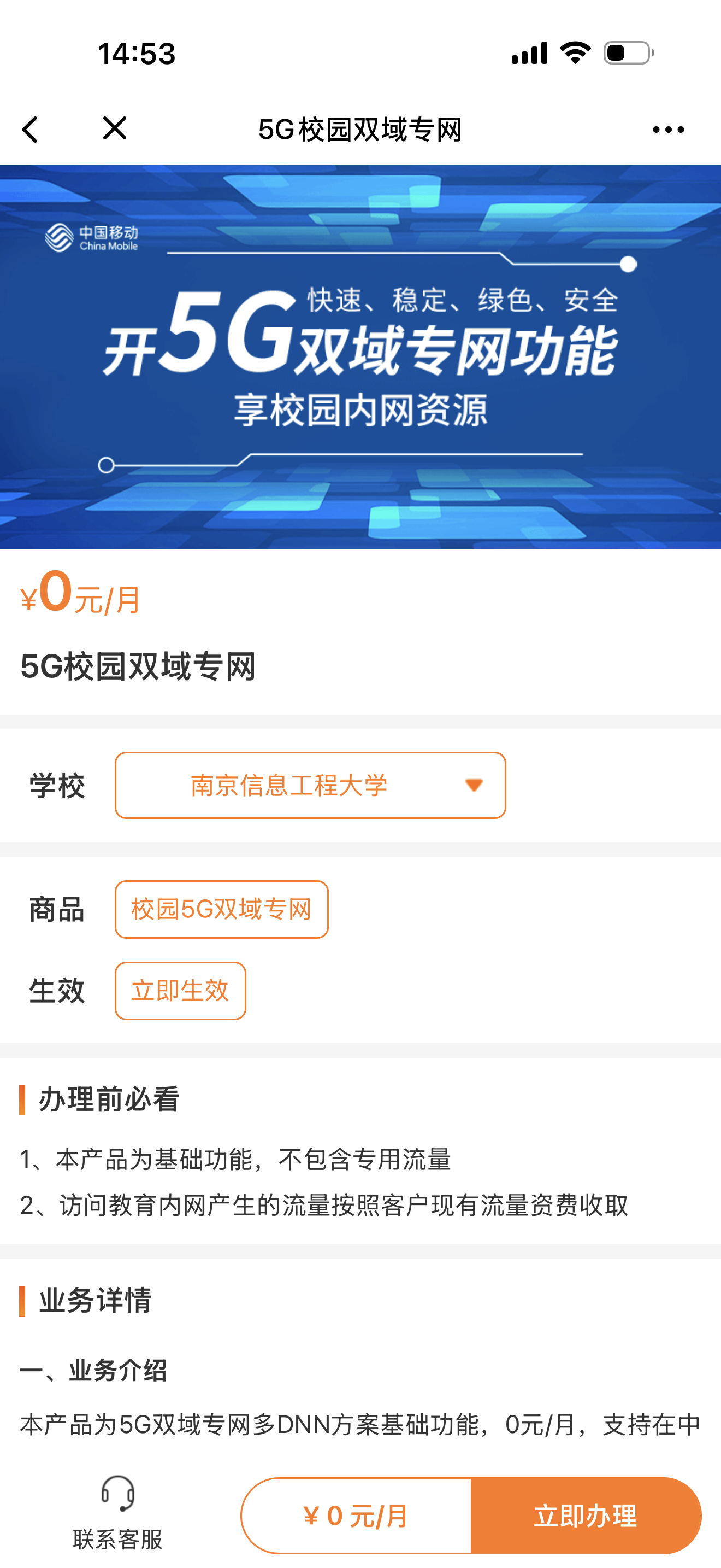 (2)登录移动账号后根据页面提示,学校选择“南京信息工程大学”,点击“立即办理”,根据指引完成开通。