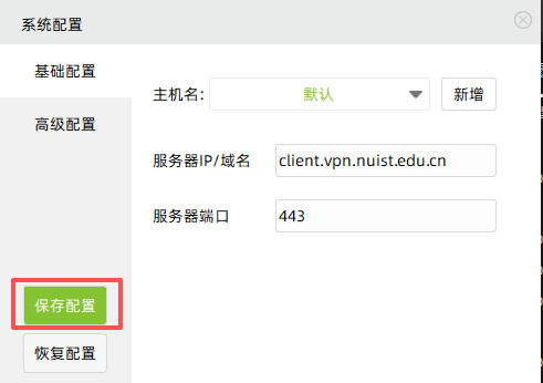 (3)输入服务器域名(client.vpn.nuist.edu.cn)以及服务器端口(443),并点击“保存配置”