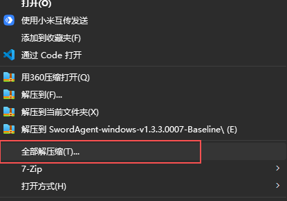 (1)下载完成后,右击弹出菜单,选择“全部解压缩...”解压缩